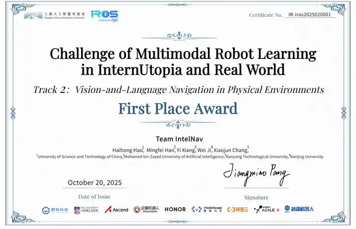 我们荣幸地宣布,在近期举办的"多模态机器人学习挑战赛"中,来自中国科学技术大学、穆罕默德·本·扎耶德人工智能大学、南洋理工大学及南京大学的联合团队"IntelNav"凭借其在"物理环境中的视觉与语言导航"赛道上的卓越表现,荣获第一名.